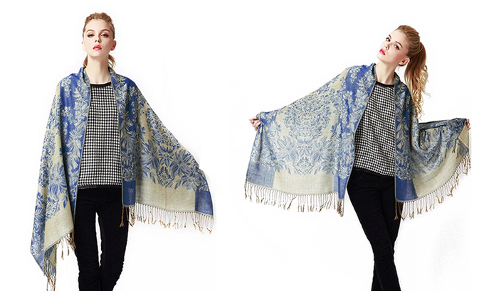 Μία μαντήλα υψηλής ποιότητας με ζακάρ σχέδιο λουλουδιών και κρόσσια.